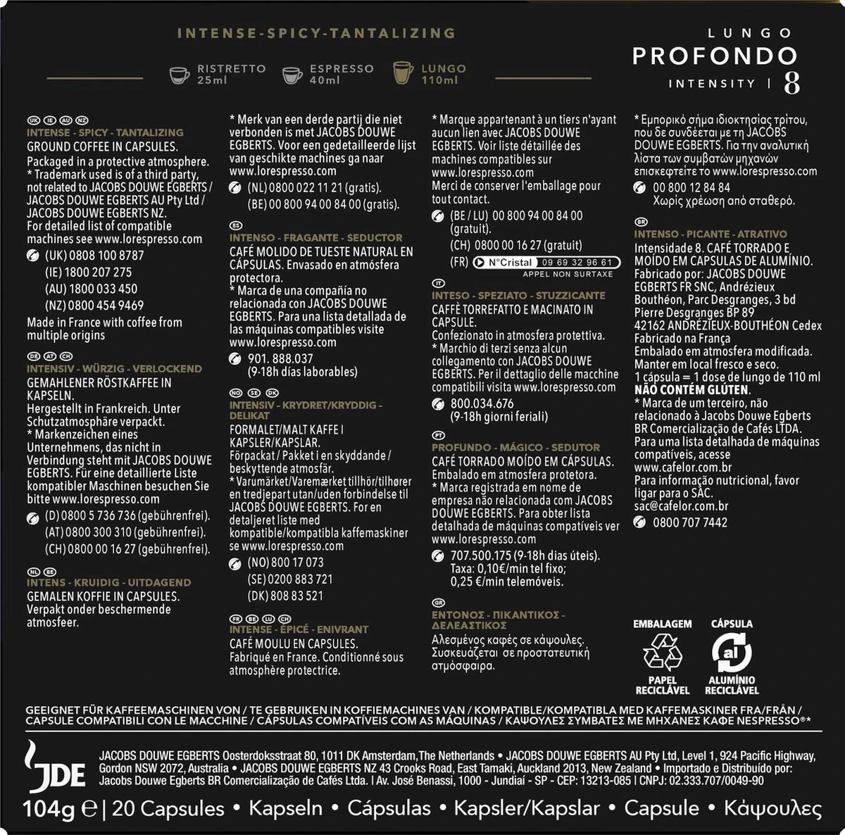 L’OR Lungo Profondo Koffiecups – Intensiteit 8/12 – 10 X 20 Capsules